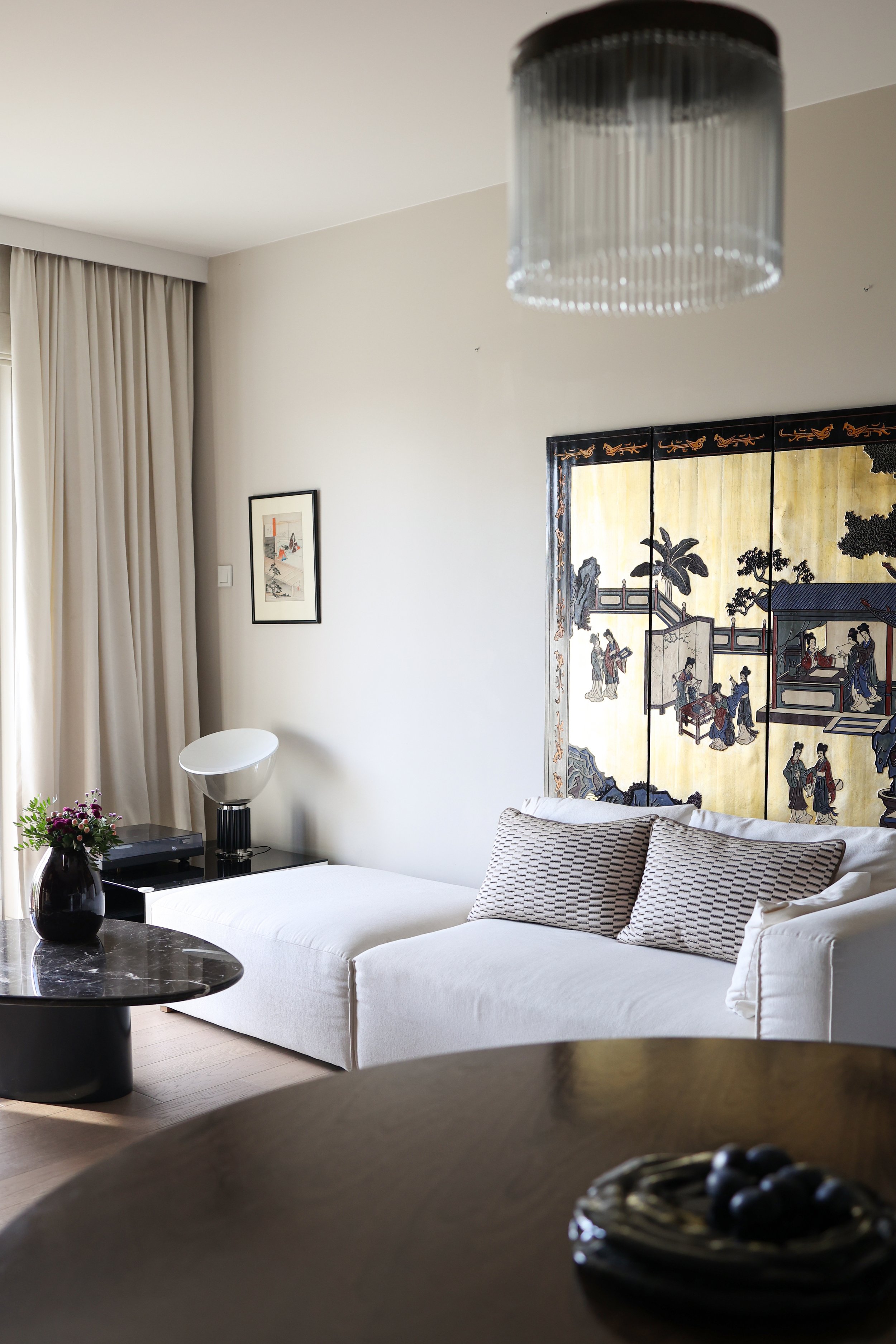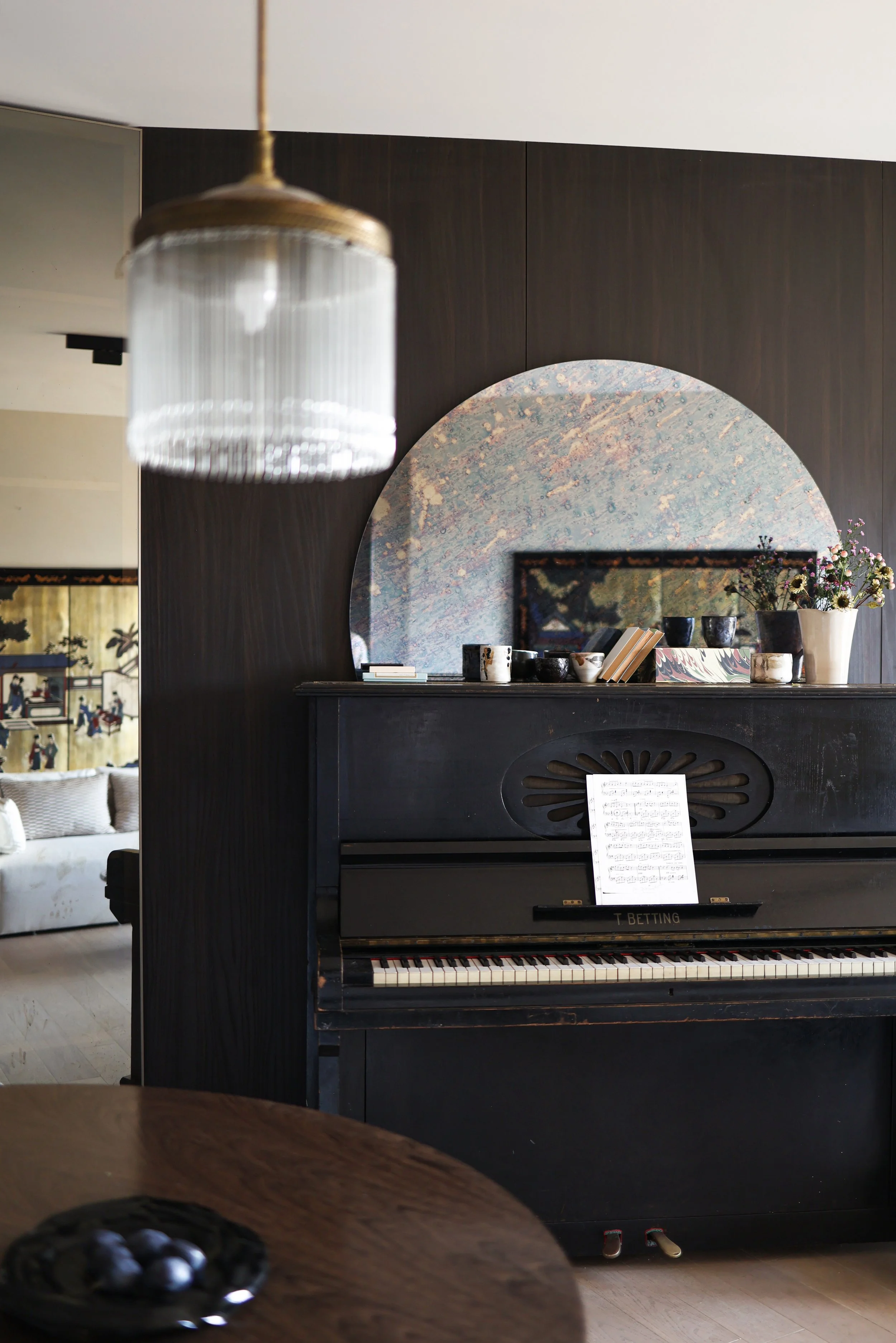Natural colors based on warm, caramel shades combined with the softness of antique pieces allowed us to achieve a coherent and historical character of the interior. The nobility of the materials used and their natural values were the starting point for creating an interior in which the materials enter into a visual dialogue. Brushed walnut veneer, the unique pattern of natural Emperador Brown marble, the shiny silk of pearl carpets and then soft, golden details on antiques are an ephemeral background for the play of light and shadow, which highlights their values depending on the time of day. The dining table, coffee table, mirror and built-in furniture are designed in the studio.